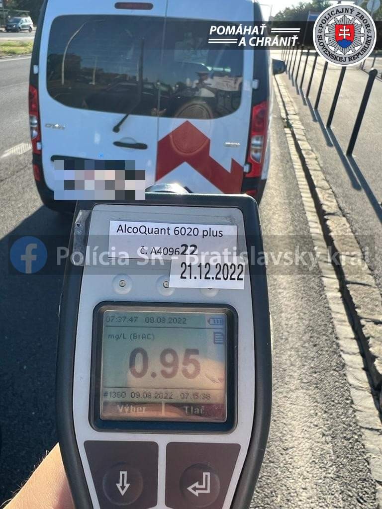 Vodiča (57) zastavili na Ružinovskej ulici. Jeho dychová skúška dopadla s pozitívnym výsledkom. Nameraná hodnota sa vyšplhala na 0,95 mg/l alkoholu v dychu, čo predstavuje 1,98 promile.