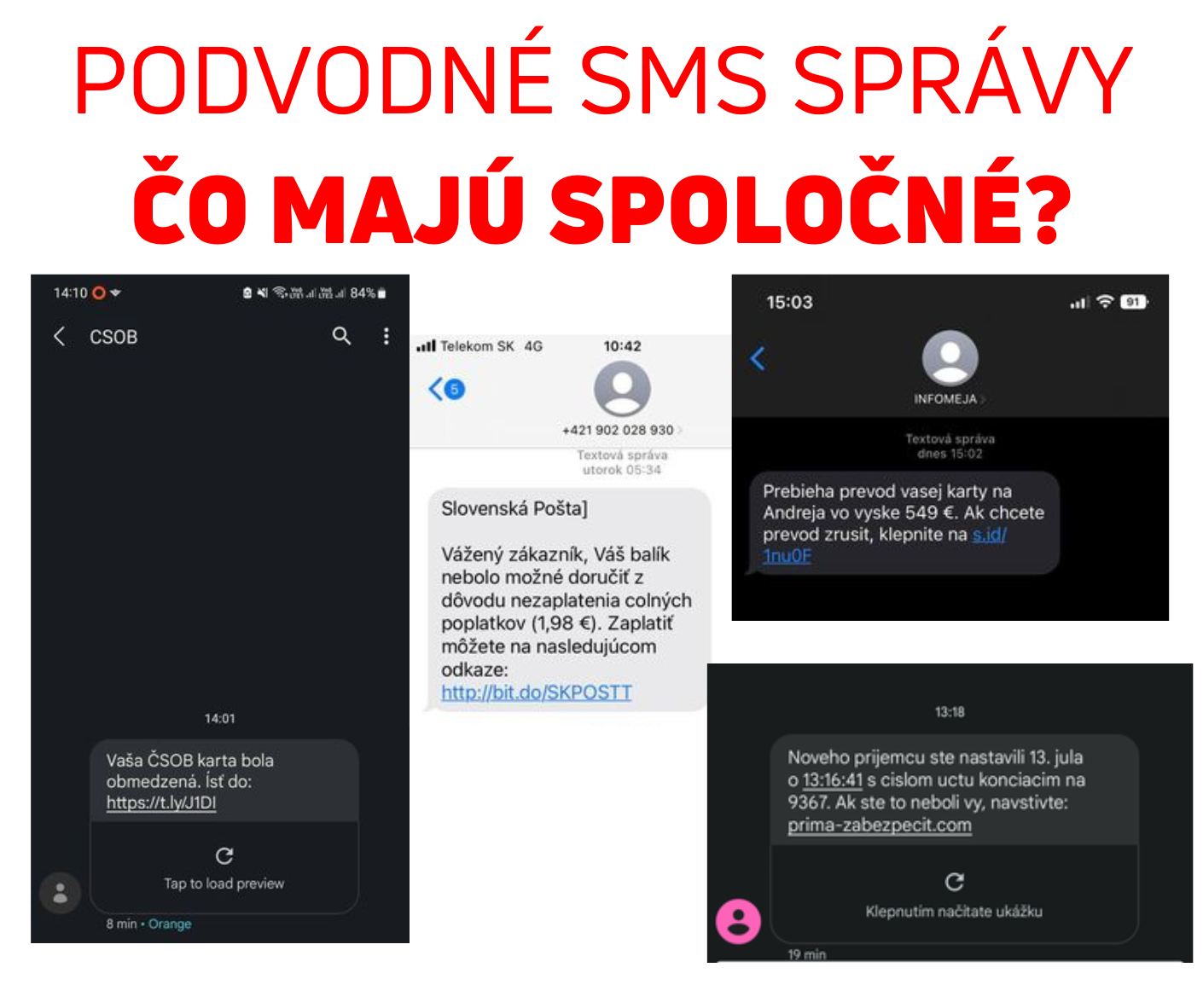 "Všetky tieto správy majú spoločného menovateľa. Link, kam kliknete, zadáte údaje vašej karty a podvodník vám môže veselo vybieliť účet. Dávajte si na to pozor. Spomeňte si na tieto tri pohľady pri najbližšej SMS správe. Takto viac smskovým podvodníkom nenaletíte," dodáva stránka na sociálnej sieti.