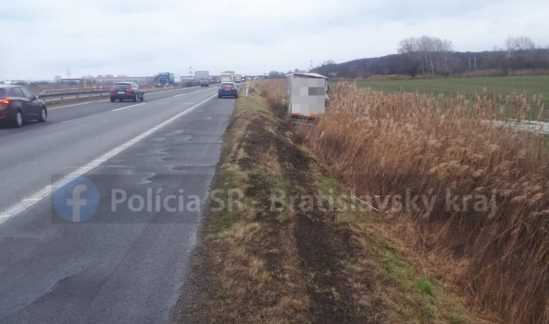 Vodiči pozor, na diaľnici D2 zišiel kamión mimo vozovku, budú ho odstraňovať