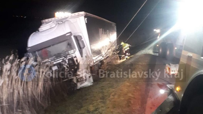 Diaľniční policajti z Bratislave riešiakamión, ktorýsa ocitolmimo diaľnice . Večer sa tomuto úseku radšej vyhnite.