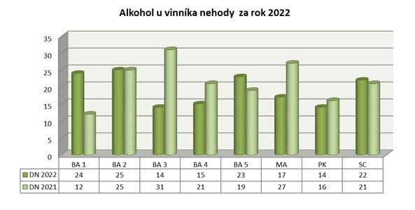 Alkohol u vinníkov dopravných nehôd zistili v 154 prípadoch (v roku 2021 ich bolo 172).