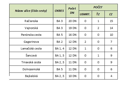 Zaujímavý je i údaj, na ktorých uliciach došlo k najväčšiemu počtu dopravných nehôd. Prvé tri miesta obsadili Račianska, Vajnorská a Panónska cesta. Na týchto uliciach však, našťastie, nikto pri dopravnej nehode nezahynul. Štatisticky patrí prvých deväť miest v rebríčku ulíc s najväčším počtom nehôd väčšinou práve tým najdlhším uliciam (výnimkou je vôbec najdlhšia ulica v Bratislave - Devínska cesta, ktorá sa do prvej deviatky nedostala).