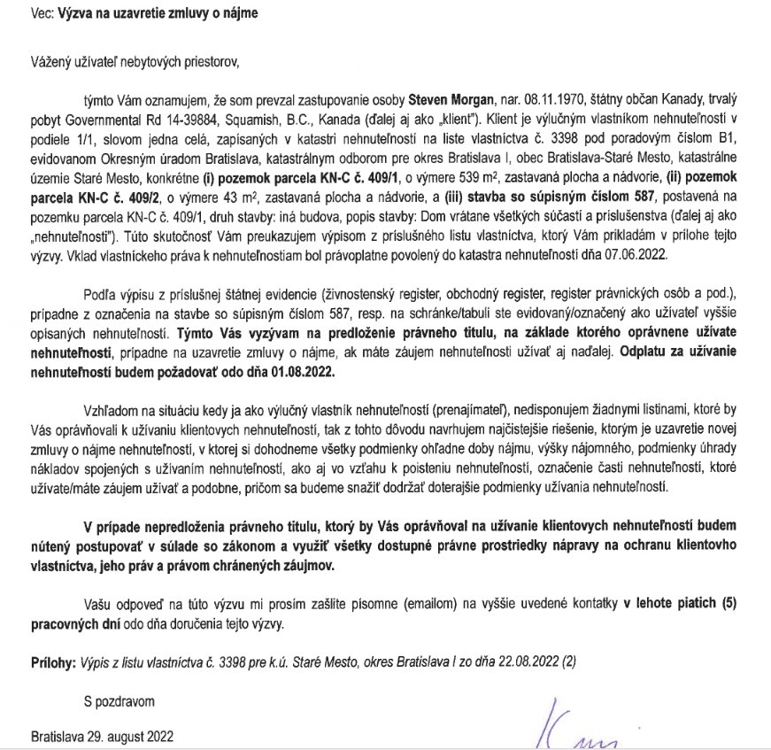 Veľký zlom nastal v minulom roku. Nájomníci, ktorí v budove sídlia, dostali list od právneho zástupcu nového majiteľa. Informoval ich, že majiteľom celej budovy je Steven Morgan z Kanady, čo i doložil výpisom z katastra. Zároveň ich vyzval, aby mu zaslali svoje nájomné zmluvy či doklady o právnom vzťahu k priestorom s tým, že si dohodnú ďalšie podmienky a môžu uzavrieť zmluvu o nájme. V budove sídli napríklad firma EKOS PLUS. Jej zástupcovia doklady zaslali, na stretnutie prišli a so zástupcom nového majiteľa sa predbežne dohodli, že nájom bude pokračovať po starom. Vyzeralo to teda, že z ich pohľadu sa nič podstatné nemení. Odvtedy s nimi nik nekomunikoval, až došlo k súčasnému stavu, keď sa od soboty nevedia dostať do práce.