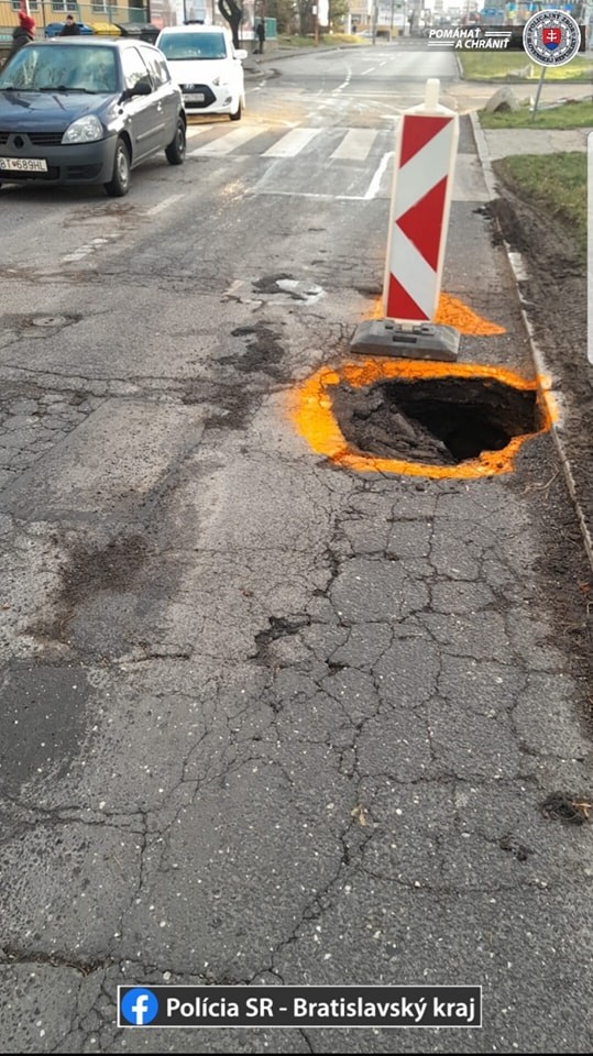 Po 15.30 h sa tu totiž prepadla časť vozovky v ľavom jazdnom pruhu, pričom sa vytvorila jama s rozmermi 1x1,2 metra a hĺbkou jeden meter.