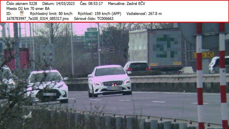 Prvého vodiča policajti v Bratislave na úseku diaľnice D2 v okrese Bratislava - Petržalka smer mesto namerali dňa 14.03.2023 v ranných hodinách. Vodič šoféroval auto Mercedes, s ktorým jazdil rýchlosťou 141km/h, čím prekročil najvyššiu dovolenú rýchlosť o 61km/h.