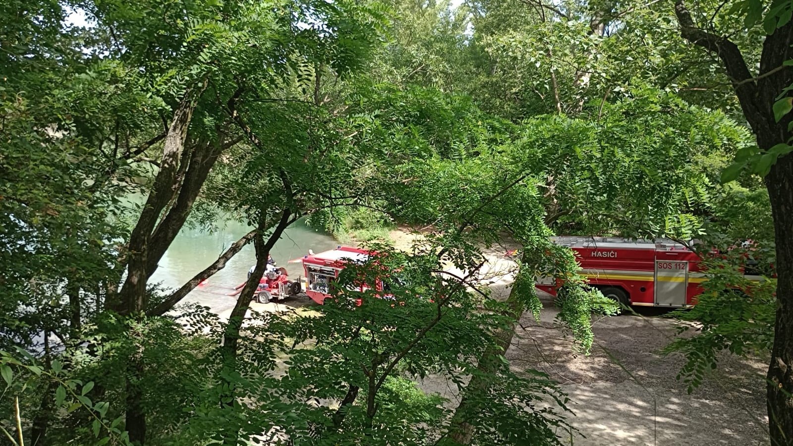 Hasiči naberajú vodu z neďalekého jazera.