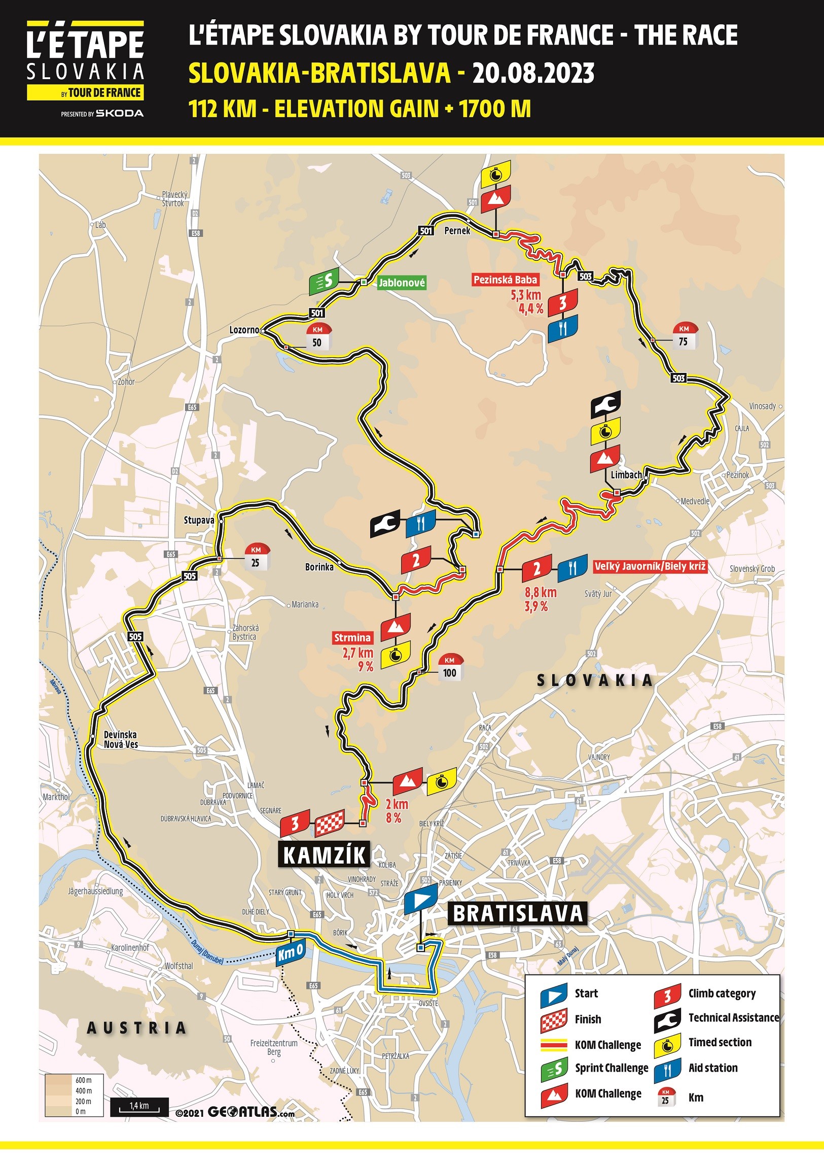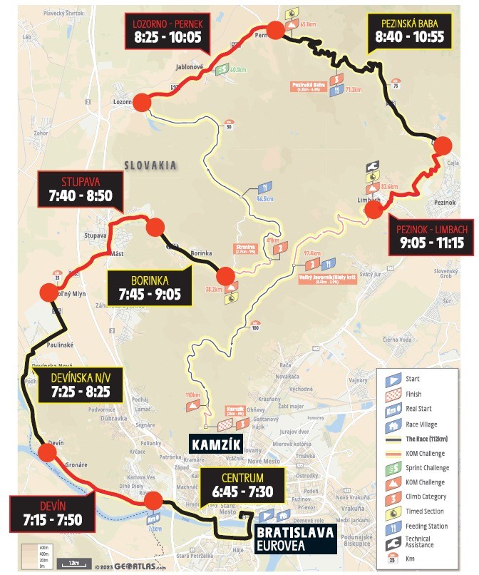 Preteky odštartujú o 07.00 hod od obchodného centra Eurovea a pokračujú po komunikáciách v okresoch Bratislava IV, Malacky a Pezinok a s cieľom krátko po 10.00 hod na Kamzíku v okres Bratislava III.