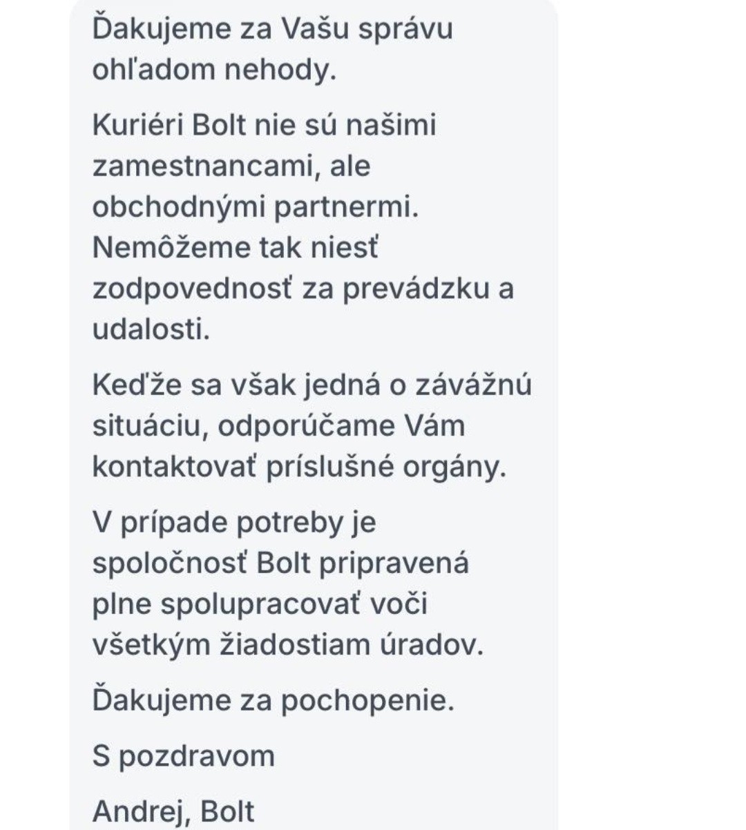 Mirka oslovila cez servis zákazníckej podpory aj známu spoločnosť. Dočkala sa najskôr dvoch rôznych reakcií. V súčasnosti to už vyzerá, že dotyčného kuriéra čoskoro presne identifikujú. Najskôr jej však odpísali: "Ďakujeme za Vašu správu ohľadom nehody. Kuriéri Bolt nie sú našimi zamestnancami, ale obchodnými partnermi. Nemôžeme tak niesť zodpovednosť za prevádzku a udalosti. Keďže sa však jedná o závažnú situáciu, odporúčame vám kontaktovať príslušné orgány. V prípade potreby je spoločnosť Bolt pripravená plne spolupracovať voči všetkým žiadostiam úradov. Ďakujeme za pochopenie," odpísali najskôr Mirke s tým, že s políciou budú spolupracovať.