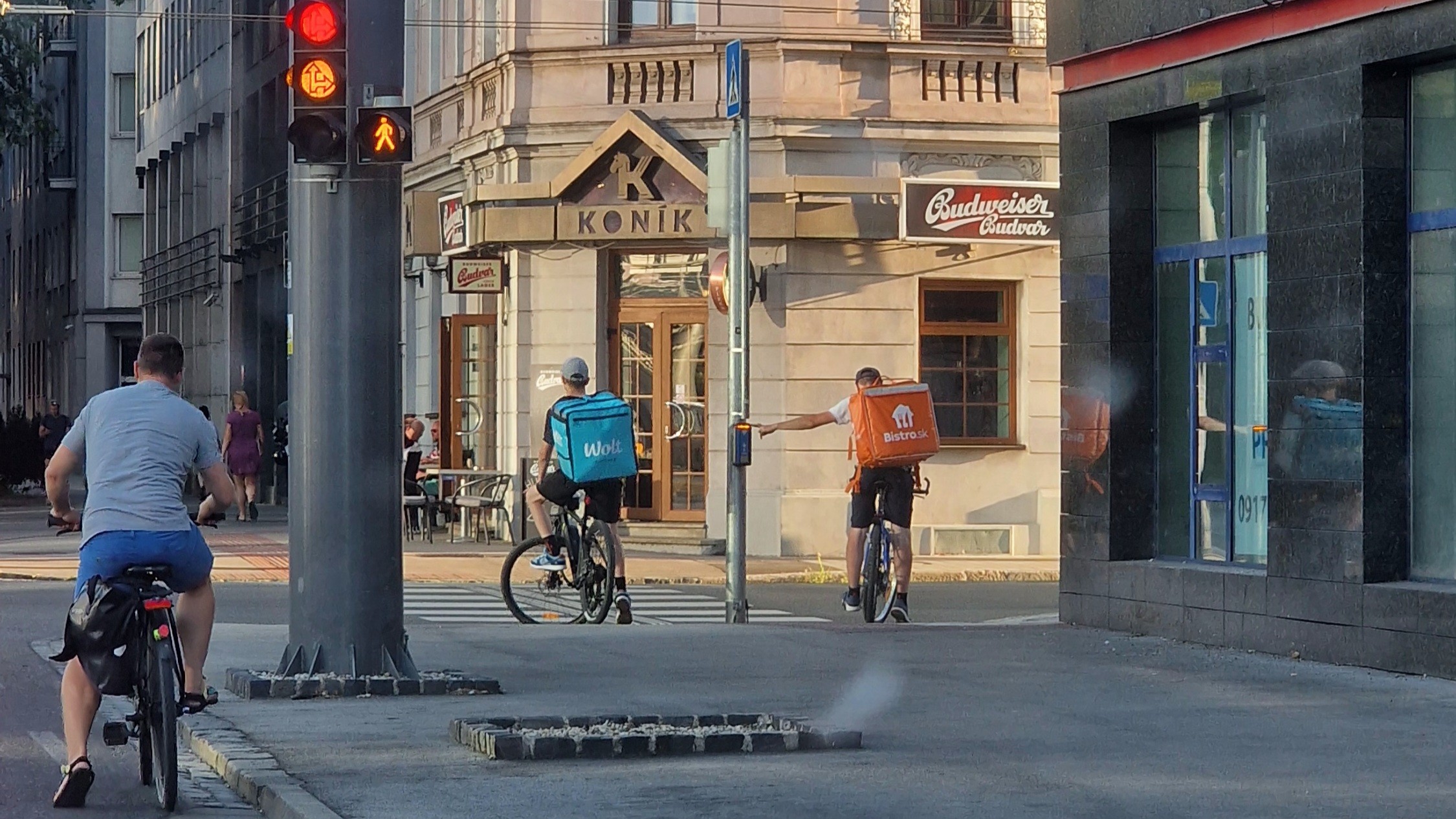 Cyklokuriérov rôznych spoločností je plné mesto, aj týchto sme odfotili dnes na chodníku.