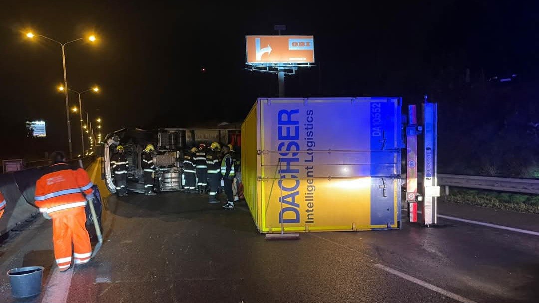 Na diaľnici D2 pri Lamači sa prevrátil kamión