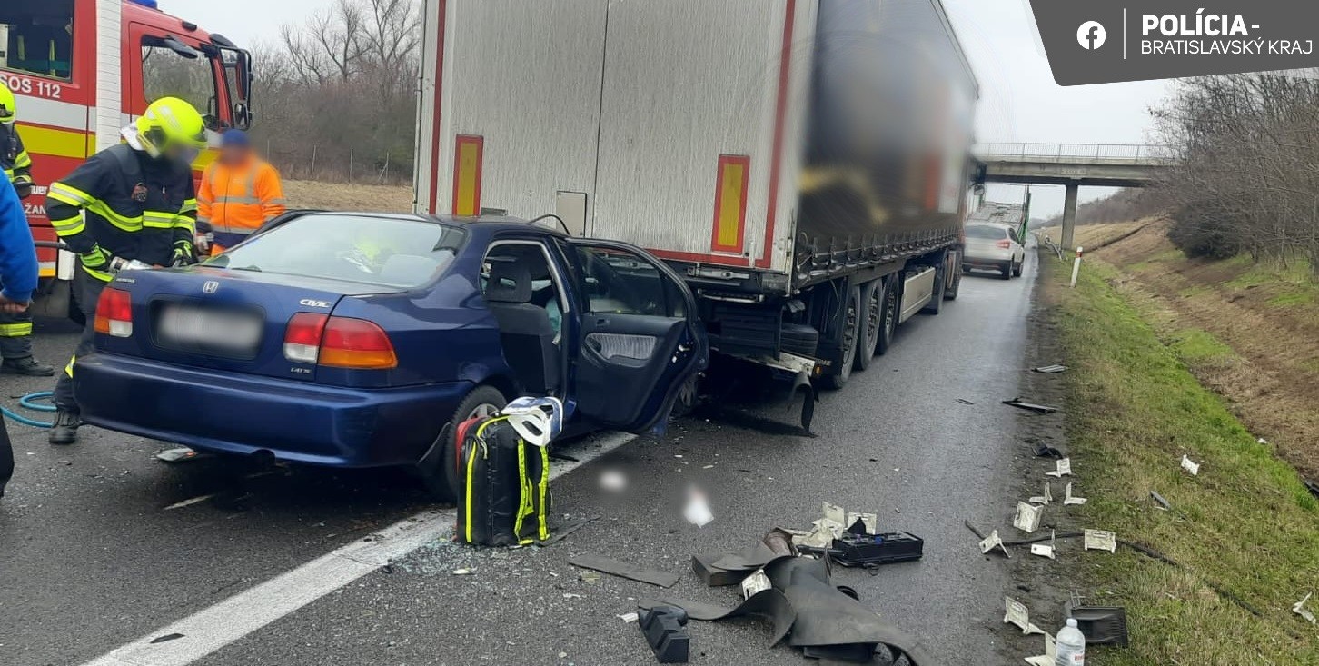 Nehoda sa stala na diaľnici D2 na kilometri 45 v smere z Malaciek do Bratislavy. "Podľa doposiaľ nezistených príčin vodič vozidla zn. Honda narazil do návesu nákladného vozidla, ktorý stál v kolóne vozidiel," informovala nás policajná hovorkyňa Silvia Šimková.