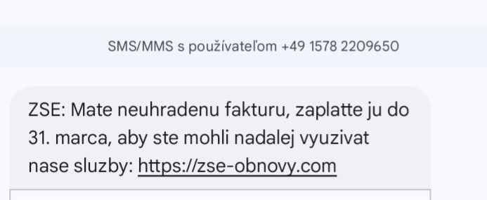 Rovnaký problém zaznamenala koncom minulého týždňa aj spoločnosť ZSE Energia. Spoločnosť vyhlásila, že nie je odosielateľom takejto správy, zákazníci majú možnosť overiť si úhradu svojich pohľadávok na zákazníckej linke 0850 111 555 alebo prostredníctvom online zákazníckej zóny na stránke www.zse.sk.