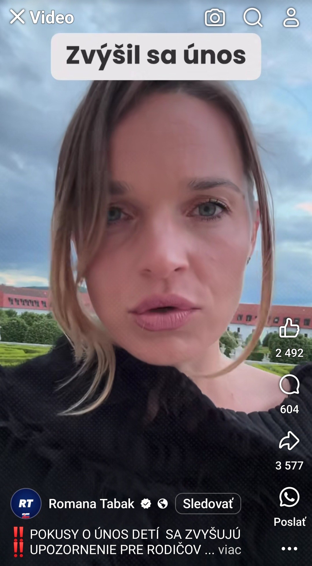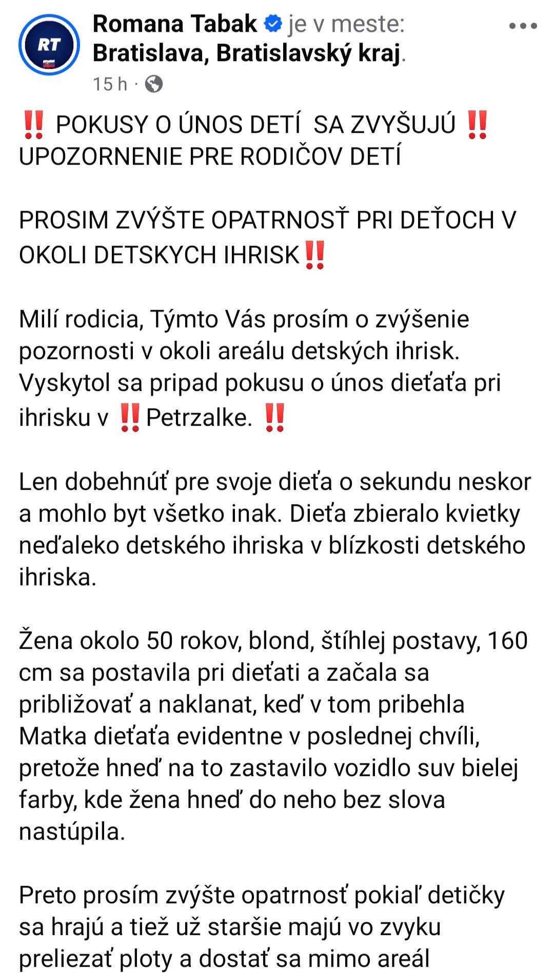 "POKUSY O ÚNOS DETÍ SA ZVYŠUJÚ! UPOZORNENIE PRE RODIČOV DETÍ... Milí rodičia, týmto Vás prosím o zvýšenie pozornosti v okolí areálu detských ihrísk. Vyskytol sa prípad pokusu o únos dieťaťa pri ihrisku v Petrzalke. Len dobehnúť pre svoje dieťa o sekundu neskôr a mohlo byť všetko inak. Dieťa zbieralo kvietky v blízkosti detského ihriska. Žena, okolo 50 rokov, blond, štíhlej postavy, 160 cm sa postavila pri dieťati a začala sa približovať a naklánať, keď v tom pribehla matka dieťaťa evidentne v poslednej chvíli, pretože hneď na to zastavilo vozidlo SUV bielej farby, kde žena hneď do neho bez slova nastúpila... Tento prípad už je oznámený na polícii, kde sa ním zaoberaju už aj kriminalisti. Rovnako k podobným prípadom pokusu o únos až štyrom nahláseným došlo len za mesiac marec- apríl tohto roku aj v pohraničnej zóne mesta Hainburg a to detí vo veku prvého stupňa základnej školy," uviedla na sociálnej sieti vo videu aj písomne Romana Tabák.