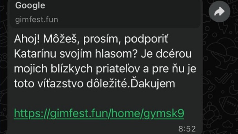 Podvodná správaPolícia varuje pred podvodnou správou o hlasovaní v súťaži pre dcéru Katarínu s priloženým odkazom cez aplikáciu WhatsApp. Informuje o tom na sociálnej sieti.