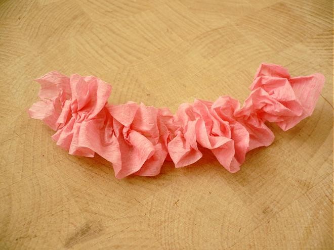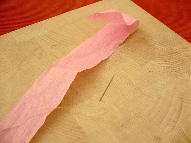 Z krepového papiera som odstrihla pás široký cca 4 cm a nazberala som ho na niť. Po nazberaní by mal byť krepový papier dlhý ako obvod rolky.