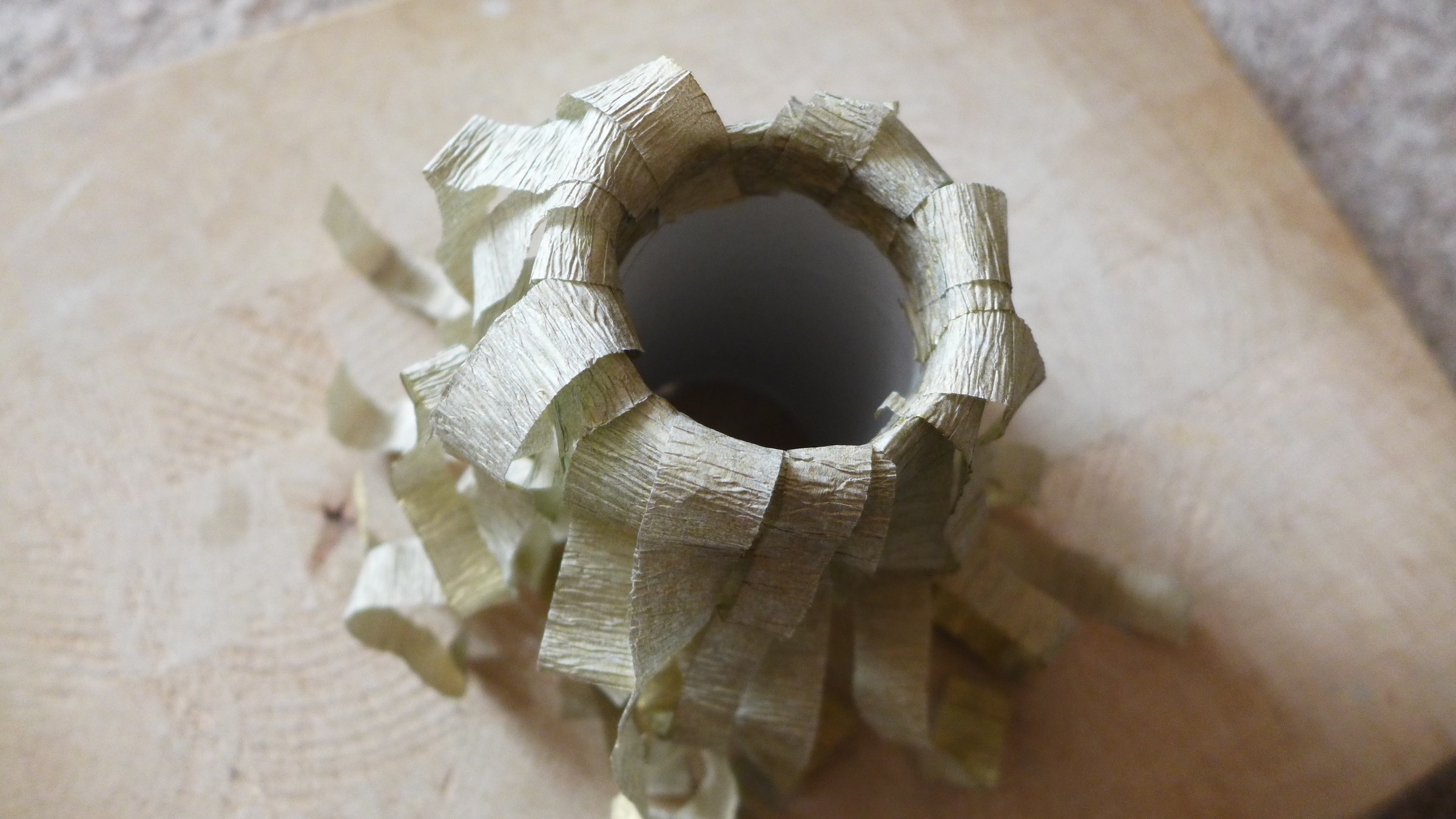 Z krepového papiera si nastriháme dlhšie pásiky a začneme ich vlepovať do rolky.