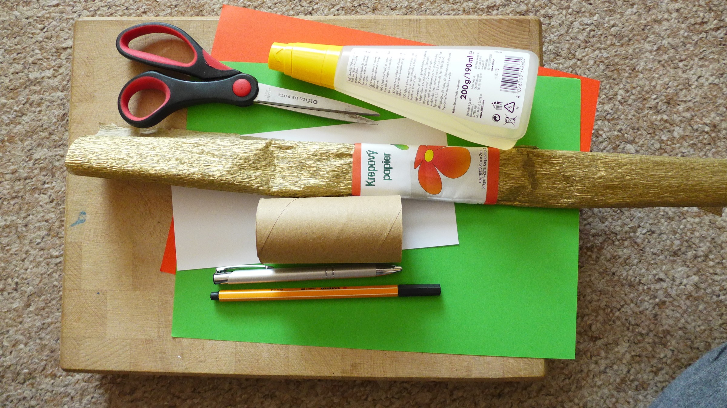 Na výrobu budeme potrebovať: farebné papiere, rolku z toaletného papiera, nožnice, lepidlo, krepový papier (kto nemá krepový papier, môže použiť sevítky alebo papierové vreckovky).