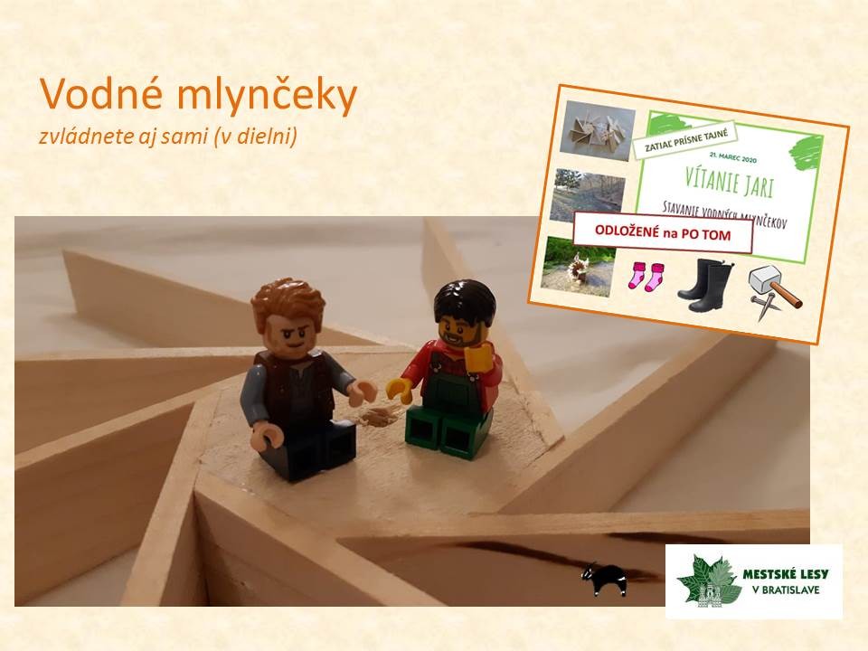 Zabavte sa doma s deťmi výrobou dreveného mlynčeka. Detailný návod krok za krokom, vrátane lego pomocníkov, pripravili lektori eko-výchovy organizácie Mestské lesy v Bratislave. Hotový mlynček potom môžete prísť otestovať na niektorý z potokov v lesoparku.