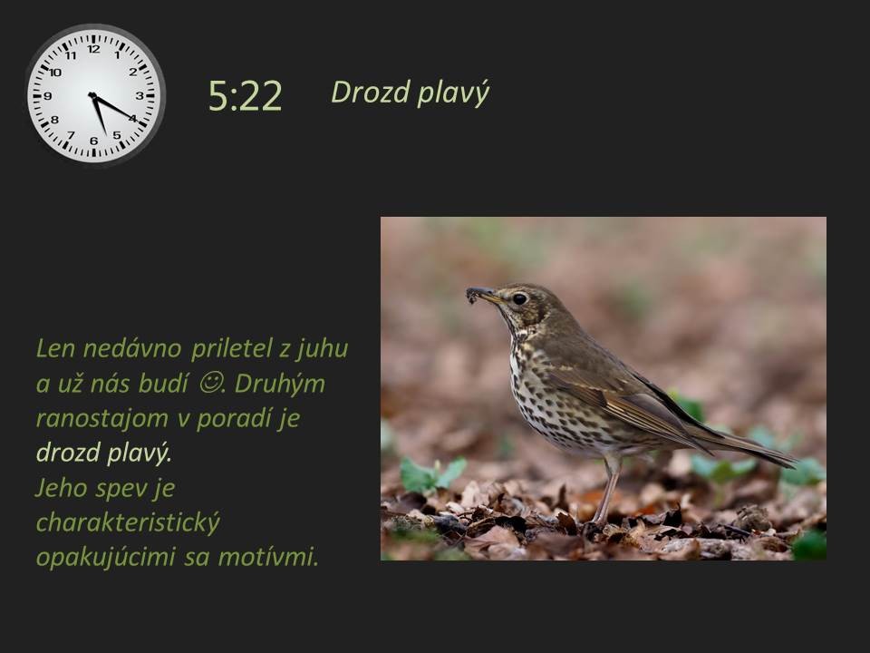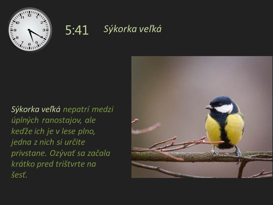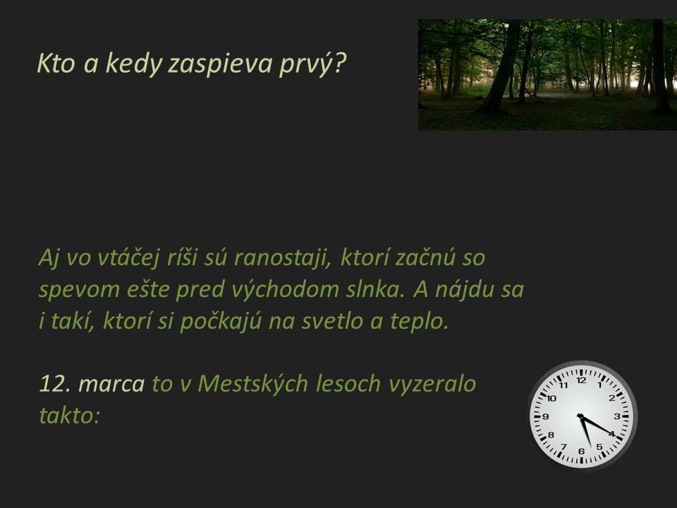 Dnes aj trochu náučne. Kto a kedy zaspieva ako prvý? Niektoré vtáky začínajú spievať skoro ráno, ešte pred východom slnka, iné si počkajú na teplo a slniečko. Vybrali sme sa to do lesa preskúmať aj s diktafónom a výsledky si môžete pozrieť v priložených obrázkoch.
