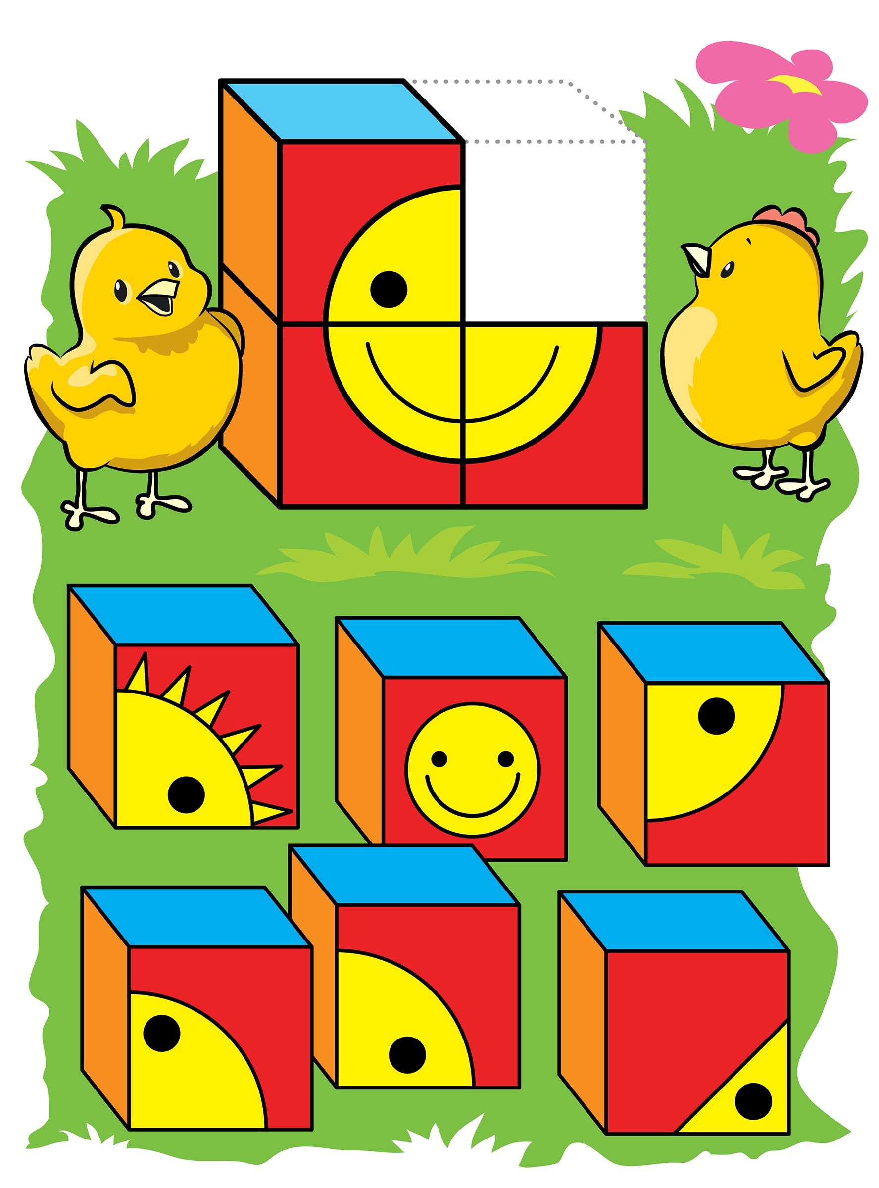 Nájdi správnu kocku ktorá chýba kuriatkam.