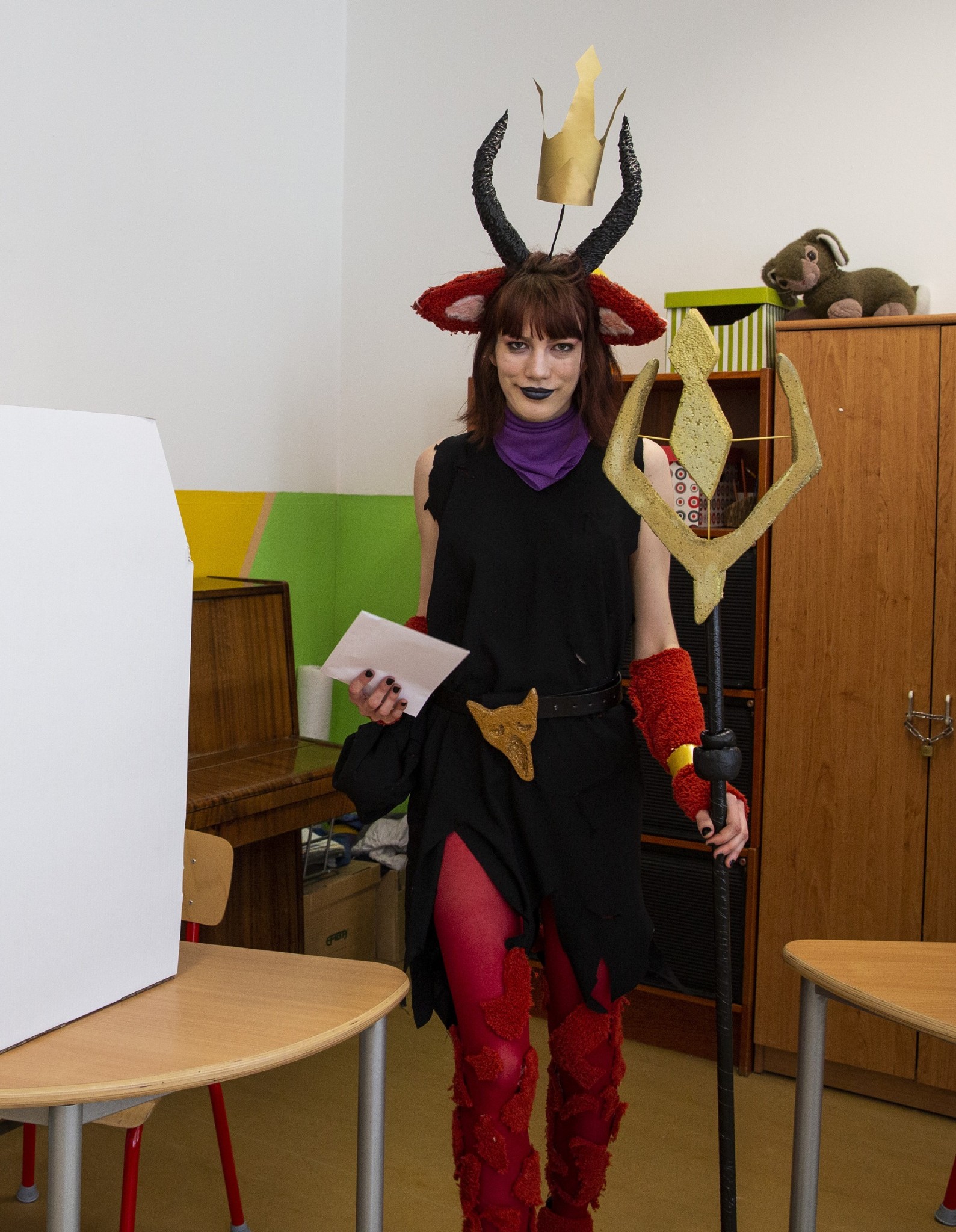 Volička v kostýme vo volebnej miestnosti na ZŠ Nevädzová 2 v Ružinove: