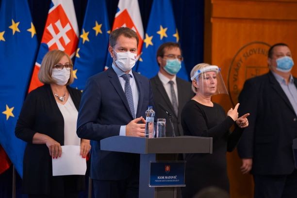 Tlmočníčka Eva Šoltýsová tlmočí na tlačovej konferencii premiéra Matoviča