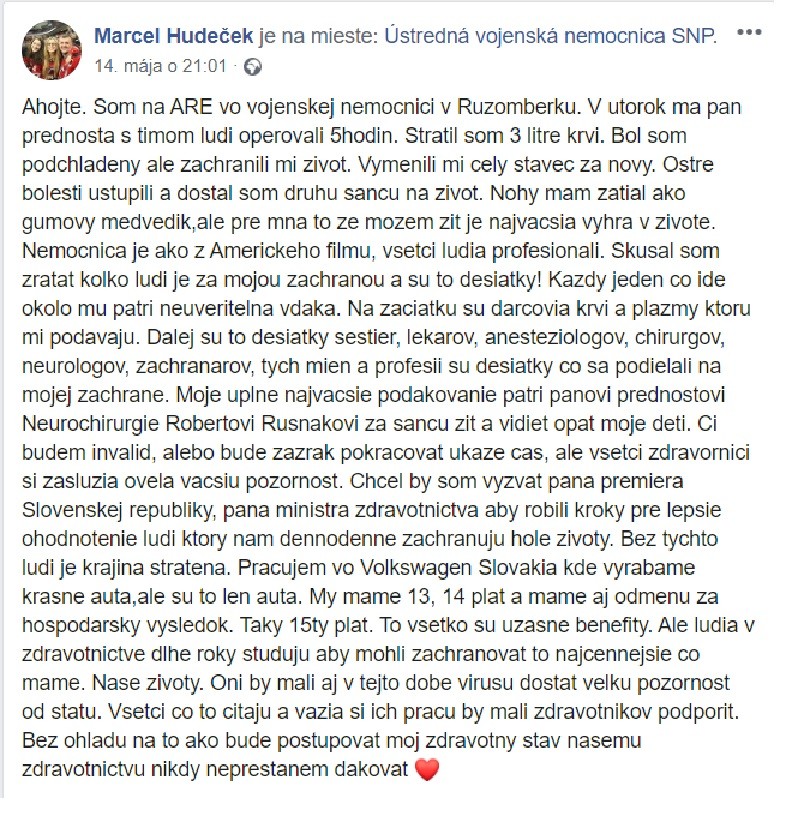 Všetko stratilo váhu, dôležité je, že som mal šťastie na ľudí a môj život bez ohľadu na aktuálny zdravotný stav stále môže pokračovať. Veľa ľudí mi písalo, či niečo nepotrebujem. Nepotrebujem. Vyhral som život. Ak chce niekto pomôcť, tak môj odkaz je: Pomôžte buď nemocnici, ktorá mi zachránila život alebo hocakému inému zdravotníckemu zariadeniu. Nikdy neviete, kedy budete vy sami potrebovať pomoc od nášho zdravotníctva...