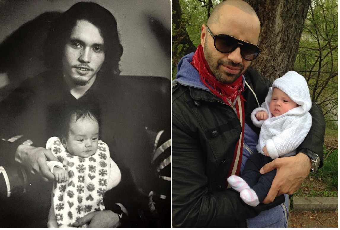 Otec Pavol Opatovský v náruči s malým Robkom v roku 1972 a otec Robo Opatovský s dcérou Hankou v roku 2014