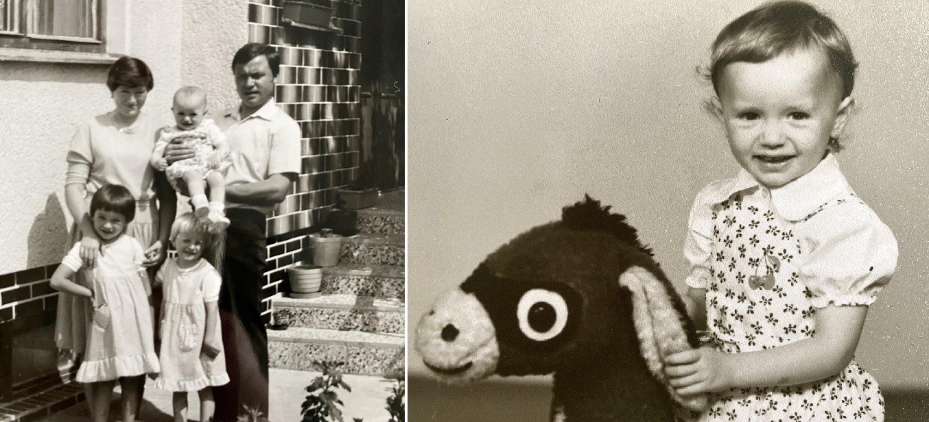 Malá Majka v otcovej náruči, pri mame stoja jej sestry Agáta a Lucia a pózovanie na oslíkovi...