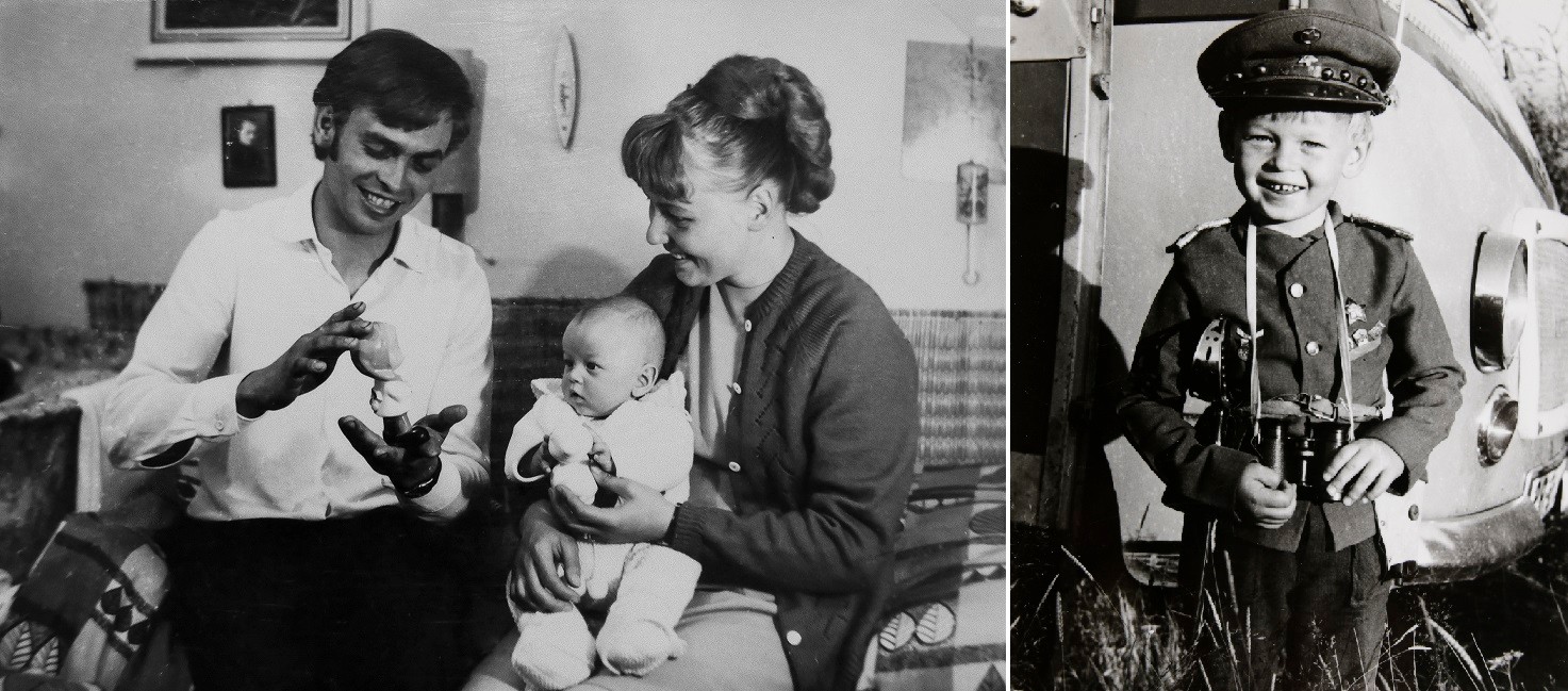 Robo ako batoľa s rodičmi v maminom náručí a v detskej vojenskej uniforme...