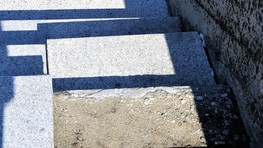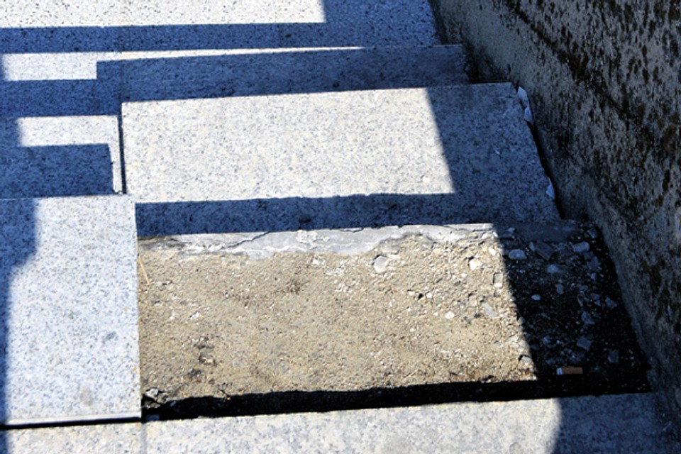 Namiesto pôvodného materiálu však použil betónové dlaždice, ktoré tu pôsobia ako päť na oko. Medzitým bol poškodený obklad na ďalších schodoch - na jednom mramorová platňa chýba, na ďalších je uvoľnená.