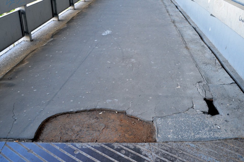 Na lávke Mosta SNP určenej pre peších sa na jej začiatku smerom zo Starého Mesta do Petržalky odlupuje betón, pod ktorým je len hrdzavá železná konštrukcia. Na dvoch miestach sú už v železe diery. Je len otázka času, kedy sa diery zväčšia. Už teraz totiž cez ne presvitá.