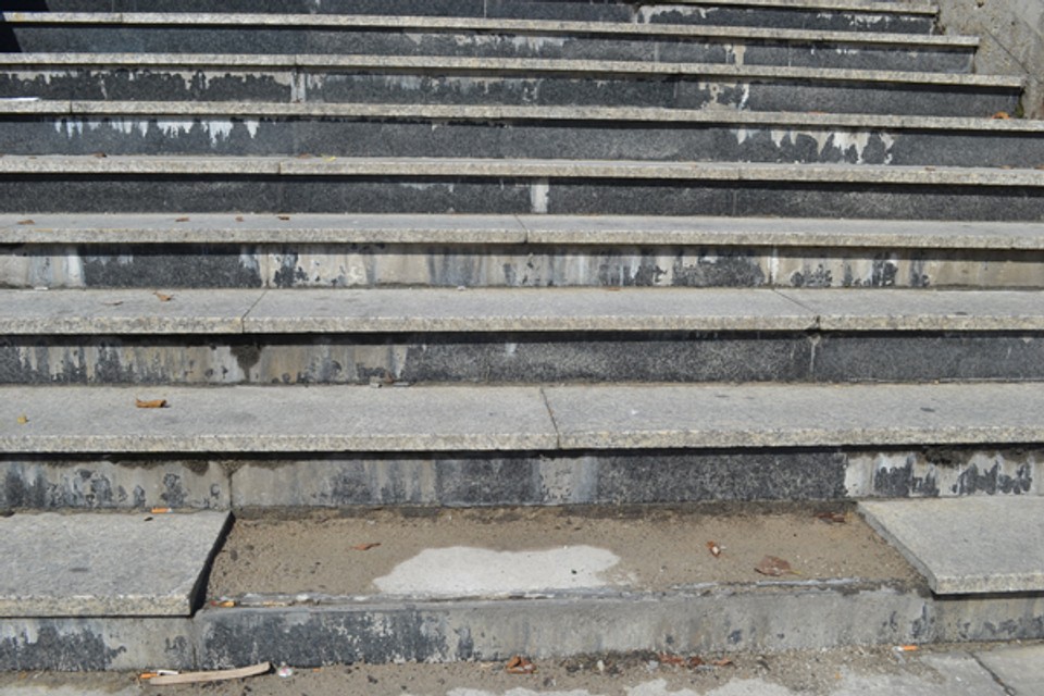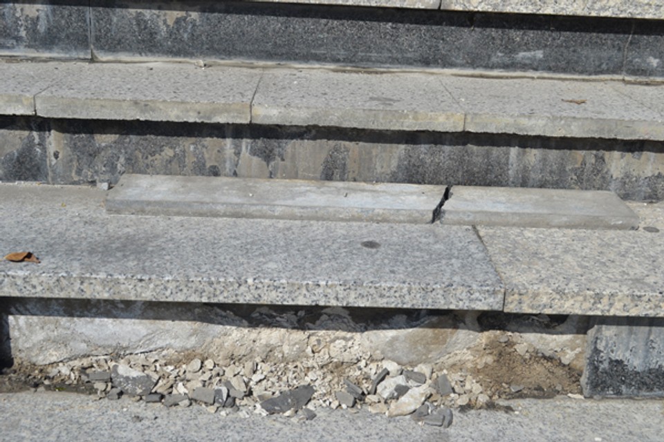 Magistrát mesta sme prvýkrát na poškodené schodisko upozornili 5. marca 2013. V polovici apríla dalo mesto poškodený obklad schodov opraviť. Namiesto pôvodného materiálu boli však použité betónové dlaždice, ktoré esteticky vytŕčajú už pri pohľade z diaľky. Napriek oprave pred necelými štyrmi mesiacmi v súčasnosti chýbajú na schodisku dve celé mramorové platne, ktoré sú položené na kraji schodiska, a na niekoľkých ďalších častiach schodiska je mramor poškodený. Z niektorých schodov sa obklad mrví, je odlúpený, pričom sa zvyšky stále nachádzajú na schodisku.