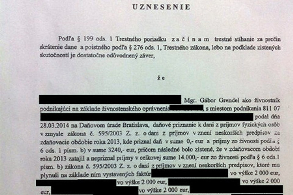 Podľa uznesenia o začatí trestného konania sa Grendel ako živnostník vyhol zaplateniu dane za rok 2013. Podľa daňového priznania priznal daň v sume 0 eur, keďže ako príjem uviedol iba sumu 3240 eur. Niektoré dostupné dokumenty však ukazujú niečo iné.