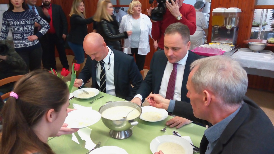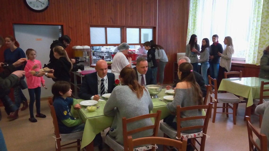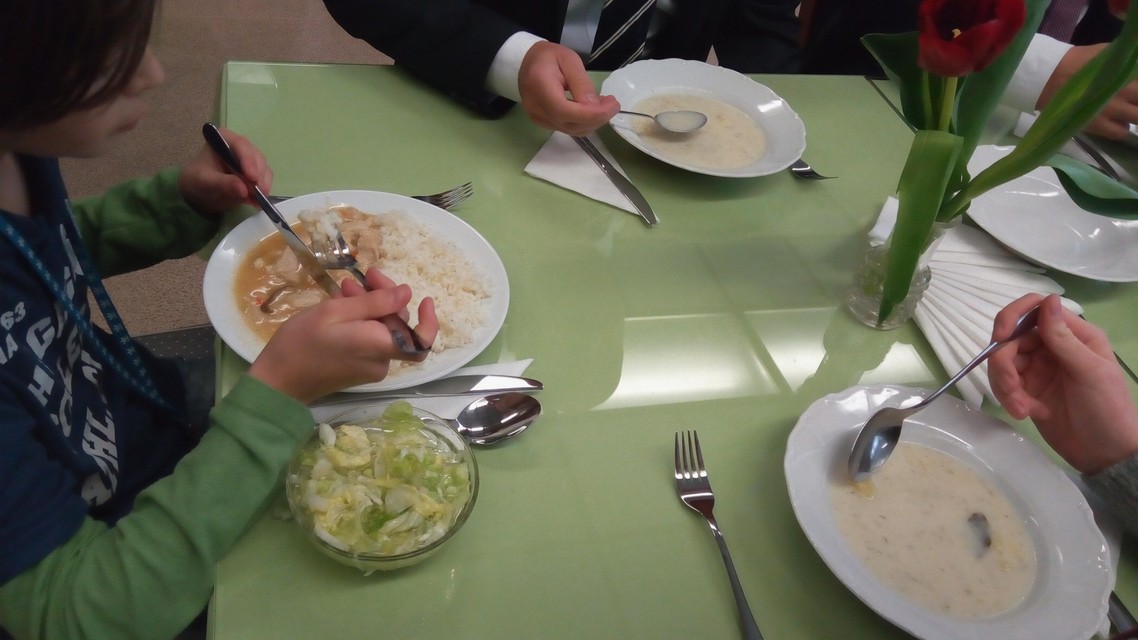 Ako sme si všimli, podávala sa zemiaková na kyslo a kuracie soté na ázijský spôsob s ryžou. Deti si mohli vybrať i parené buchty. „Veľmi dobre sme sa najedli a je to aj trochu nostalgia, vrátiť sa do školskej jedálne, zobrať si tácku, šalát alebo kompót. Bol to veľmi príjemný obed, rozprávali sme sa o pracovných témach a obedovali sme aj s dvomi žiačkami školy, s ktorými sme sa bavili o športe, ktorý robia,“ dodal Droba.