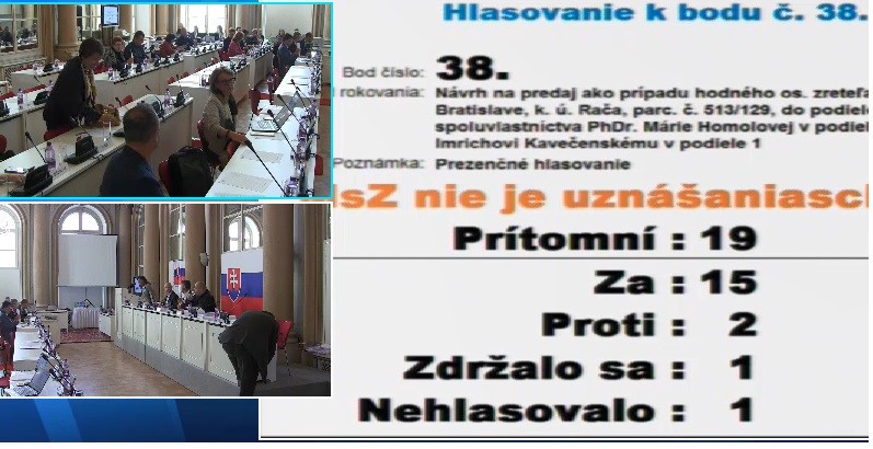 Bratislavskí mestskí poslanci vo štvrtok nepokračovali v rokovaní posledného mestského zastupiteľstva pred novembrovými komunálnymi voľbami. Mestský parlament nebol totiž dvakrát po sebe uznášaniaschopný, aj keď bola medzitým vyhlásená hodinová prestávka. V rokovacej sále bolo po druhom prezenčnom hlasovaní len 21 z celkového počtu 45 poslancov.