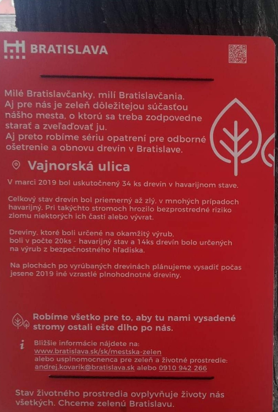 Verejnosť podľa neho musí vedieť, prečo sa výrub robí, a musí mať aj informáciu o náhradnej výsadbe. Mesto deklaruje, že realizuje sériu opatrení na odborné ošetrenie a obnovu drevín v meste. Okrem Vajnorskej môže informačné tabule verejnosť nájsť aj v Devínskej Novej Vsi či na Námestí slobody. Na plochách po vyrúbaných drevinách plánuje samospráva vysadiť počas jesene iné vzrastlé plnohodnotné dreviny.