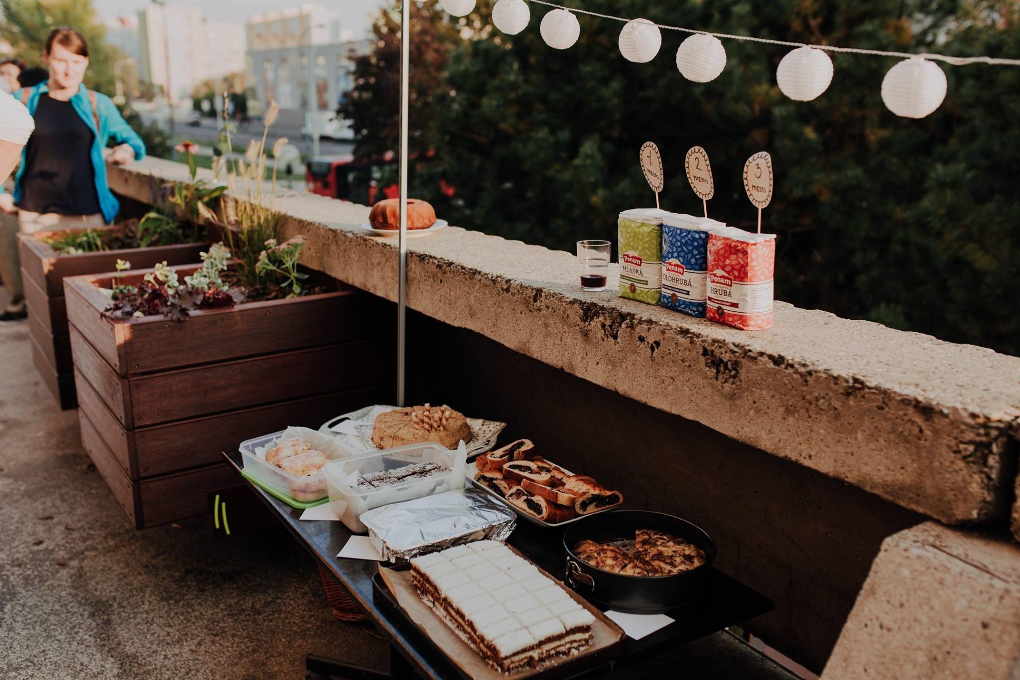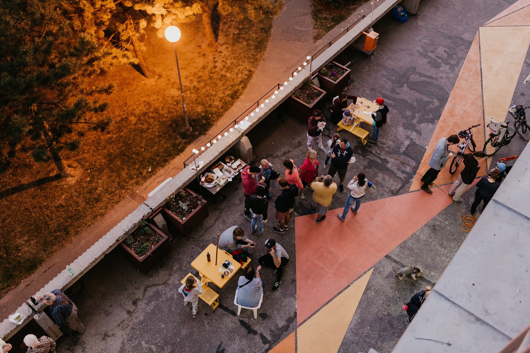 Fotografie z „happeningu“, ktorý sa konal po skončení prác, ukazujú úplne inú tvár terasy. Pusté miesto, ktoré priťahuje asociálov, sa zaplnilo miestnymi obyvateľmi. Grilovalo sa, súťažilo o susedský koláč, prišlo asi 50 susedov, niektorí sa počas brigád zoznámili a spriatelili. Takto nejak zrejme vyzerá začiatok budovania komunity. „To bol jeden z ďalších našich cieľov. Zapojiť obyvateľov do jedného tímu,“ hovorí Ján Urban. „Od začiatku sme hovorili, že základná starostlivosť o polievanie kvetov bude na nich. Zatiaľ to funguje, uvidíme,“ dodáva Lucia Uhrínová.