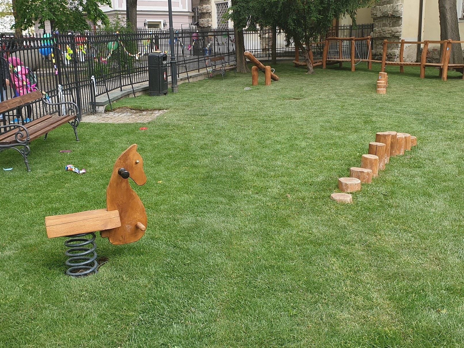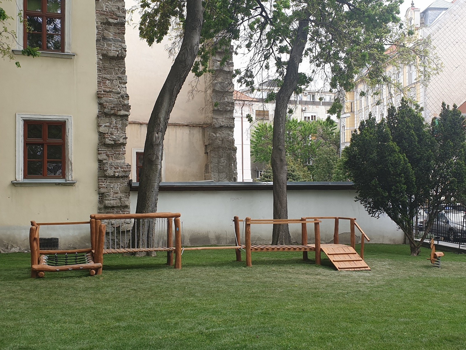 Dnešnú podobu ihriska museli schvaľovať aj pamiatkari. Objekt aj so záhradou je totiž pamiatkovo chránený. Dôvodom bolo zároveň to, aby výsledný efekt čo najmenej narušil kolorit historickej časti mesta. Hracie prvky sú preto vyrobené prírodného materiálu - z agátového dreva. Sestričky na ne získali peniaze z dotácie Úradu vlády.