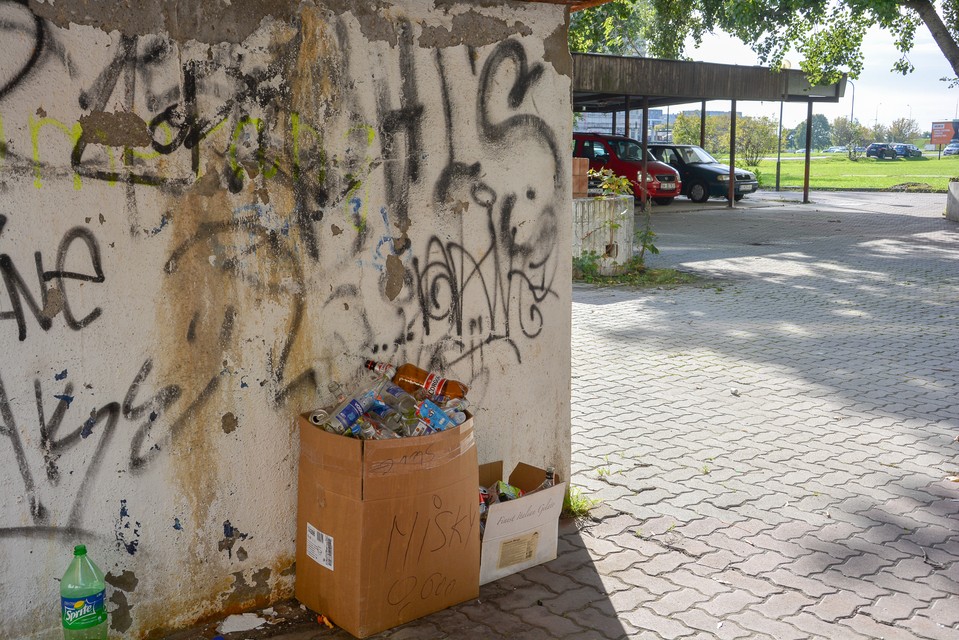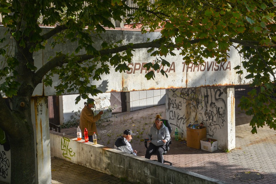 Na bývalom trhovisku skutočne už o deviatej ráno vidíme popíjať trojicu. Tekutiny majú v umelohmotných fľašiach, keď sa pri nich zastavíme, bez problémov s nami komunikujú. „Prečo nejdete do krčmy?“ pýtame sa aj ich. „Ešte nie sú otvorené a o desiatej máme už iný program,“ tvrdí žena. Aj ona nás presviedča, že to nie sú oni, kto strpčuje život tunajších obyvateľov. „My tu aj upratujeme. Pozrite sa, toto sme vyzbierali za dva dni!“ hovorí a ukazuje na papierovú škatuľu plnú fliaš od alkoholu. Koho teda sú? „No mali by ste vidieť, čo tu cez víkend vyvádzajú mladí! My tu len sedíme, aj lavičky sme si nalakovali...“