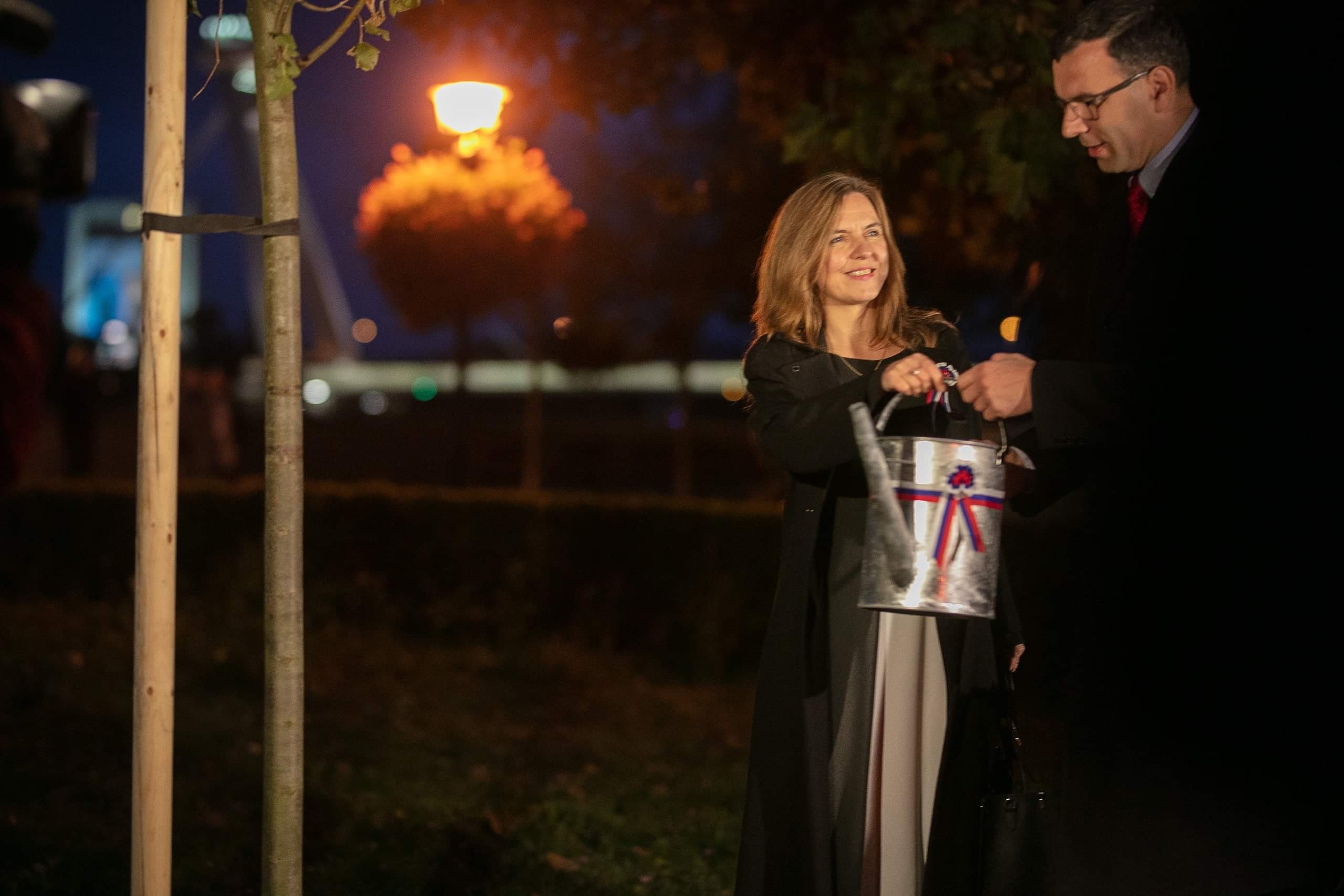 Zuzana Aufrichtová a zástupca veľvyslanca Českej republiky na Slovensku Pavel Sladký polievajú novozasadenú lipu: