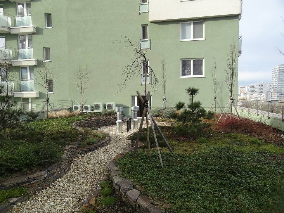 Prvou intenzívnou zelenou strechou nad obytnými priestormi sa stal pás medzi vežami polyfunkčného domu Bosákova. Dnes má desať rokov a na výške stromov je to už vidno.