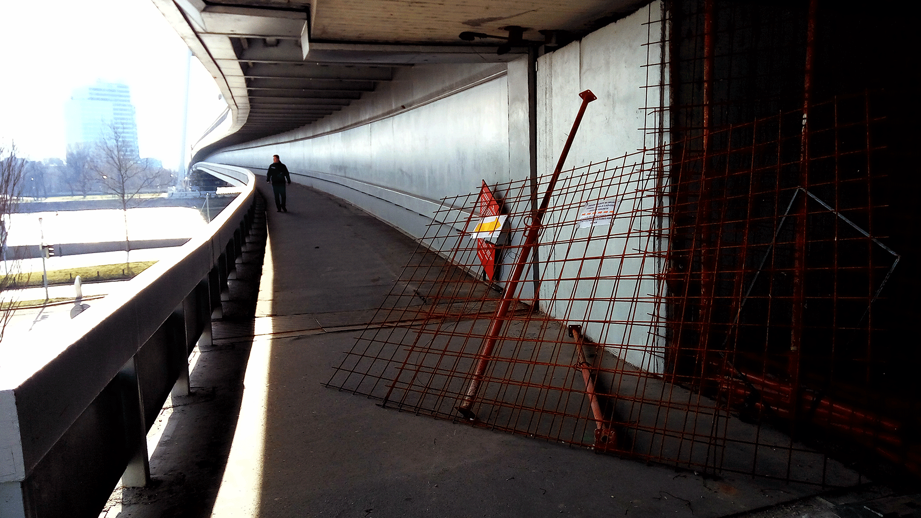 Oprava Mosta SNP, konkrétne jednej z lávok pre peších, sa naťahuje. Chodci by zatiaľ mali využívať už opravenú, tzv. viedenskú lávku, no nie je tomu celkom tak. Ako sa presvedčil náš čitateľ Alexander, ploty pri budapeštianskej lávke sú zvalené a chodci tak prechádzajú po oboch stranách mosta. Či plot zvalil nedávny silný vietor alebo ľudia, ktorých omrzelo chodiť iba po jednej strane, nevedno. Východná "zakázaná" lávka je pritom v zlom stave, cez niektoré diery vidíte i rieku pod vami.
