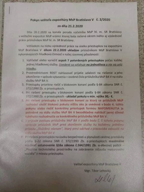 V pokyne veliteľa expozitúry MsP Bratislava V (teda najmä Petržalka) z 21.2. 2020 Tibora Lehockého, ktorý máme v redakcii, sa napríklad hliadkujúcim policajtom prikazuje: vyhľadať alebo vyriešiť aspoň sedem potvrdených priestupkov počas každej jednej hliadkovej služby (uvedené sa vzťahuje na jednotlivca a nie na celú hliadku), priestupky prioritne riešiť v blokovom konaní (teda dávať pokuty - pozn. redakcie) či ukladať pokuty v minimálnej výške 30 eur a maximálne využívať možnosť "použitia technického prostriedku na zabránenie odjazdu motorového vozidla z miesta priestupku", teda jednoducho dávať autám papuče.
