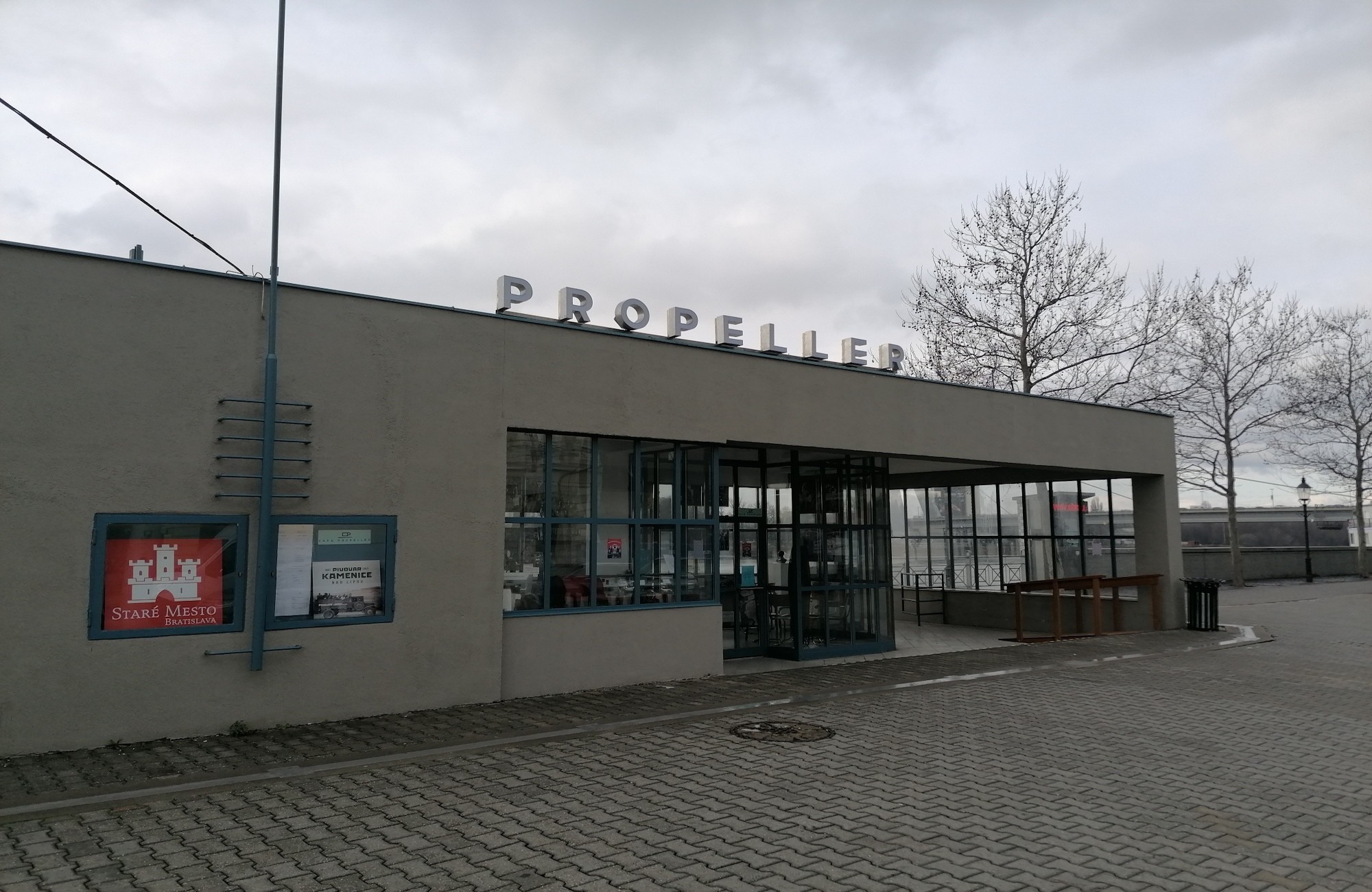 Budovu súčasného Café Propeller naprojektoval v roku 1931 známy slovenský architekt Emil Belluš ako zastávku propeleru, ktorý premával zo staromestskej strany Dunaja na petržalskú, kde má svoju "skromnejšiu dvojičku". Propeler fungoval v Bratislave 110 rokov, teda od roku 1893 do roku 2003. V tomto období bolo trvalo nasadených okolo sedem plavidiel, ďalšie vypomáhali prechodne.