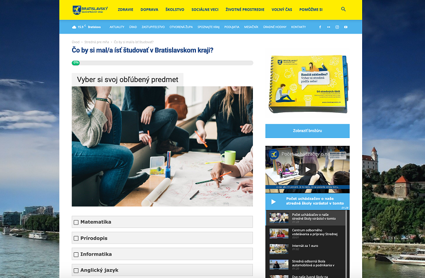 Pre uľahčenie výberu strednej školy prináša Bratislavský samosprávny kraj (BSK) interaktívny online kvíz. Žiakom základných škôl pomôže zistiť viac nielen o sebe, svojich záľubách a schopnostiach, ale najmä to, čo by mali ísť v Bratislavskom kraji študovať.