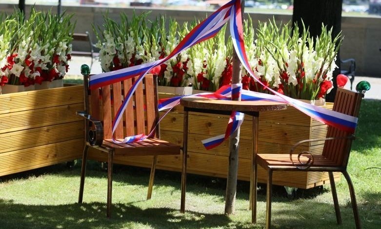 Lavičku predstavuje okrúhly stolík, cez ktorý prerastá strom, v tomto prípade javor, a okolo stola sú dve stoličky, čo má symbolizovať otvorený dialóg.