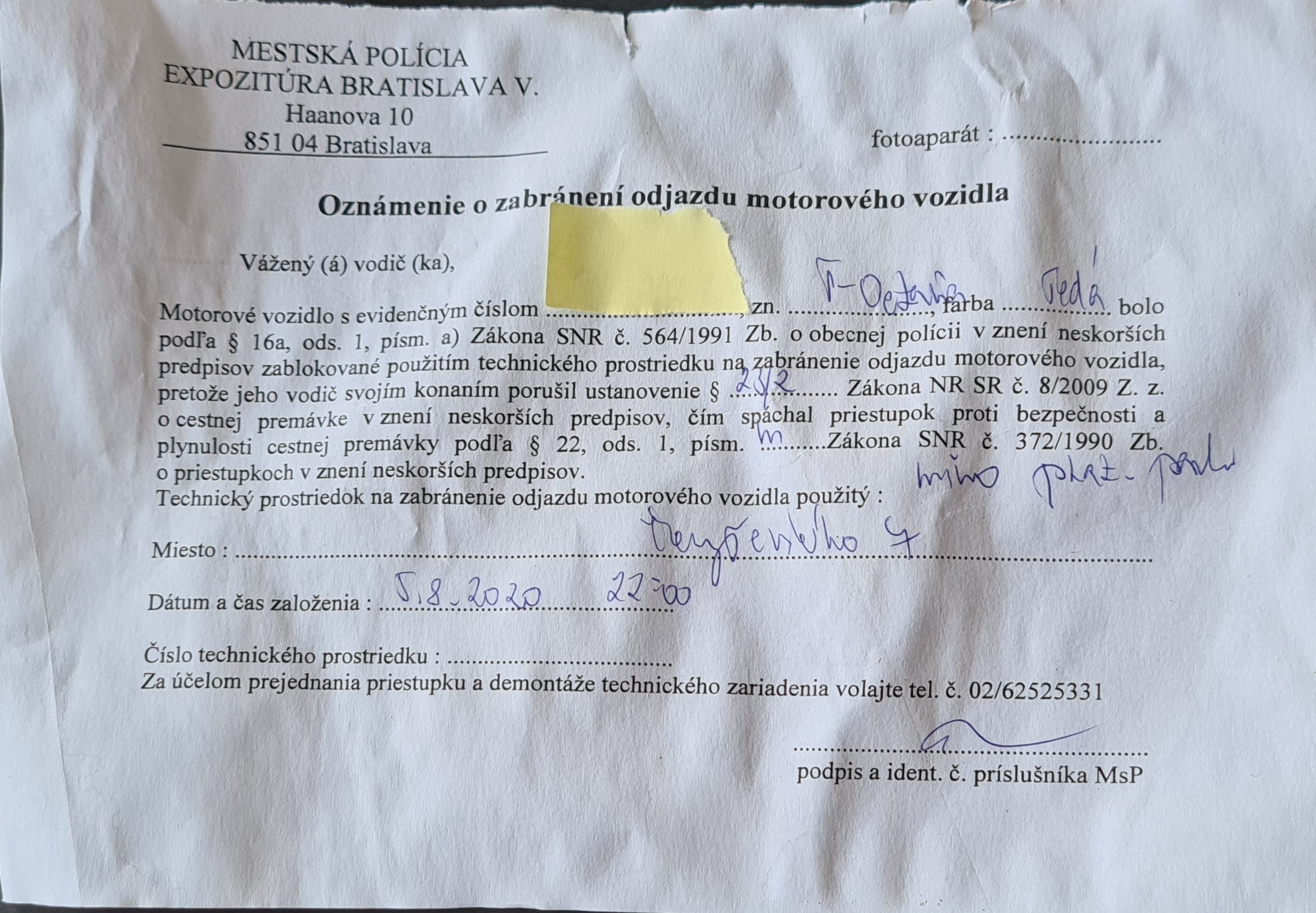 Doklad z polície hovorí, že „parkoval mimo plateného miesta“. „Sú tam ďalšie miesta, kde nie sú čiary a tam neboli papuče! Podľa akého kľúča postupuje mestská polícia?“ pýta sa dotknutý občan.