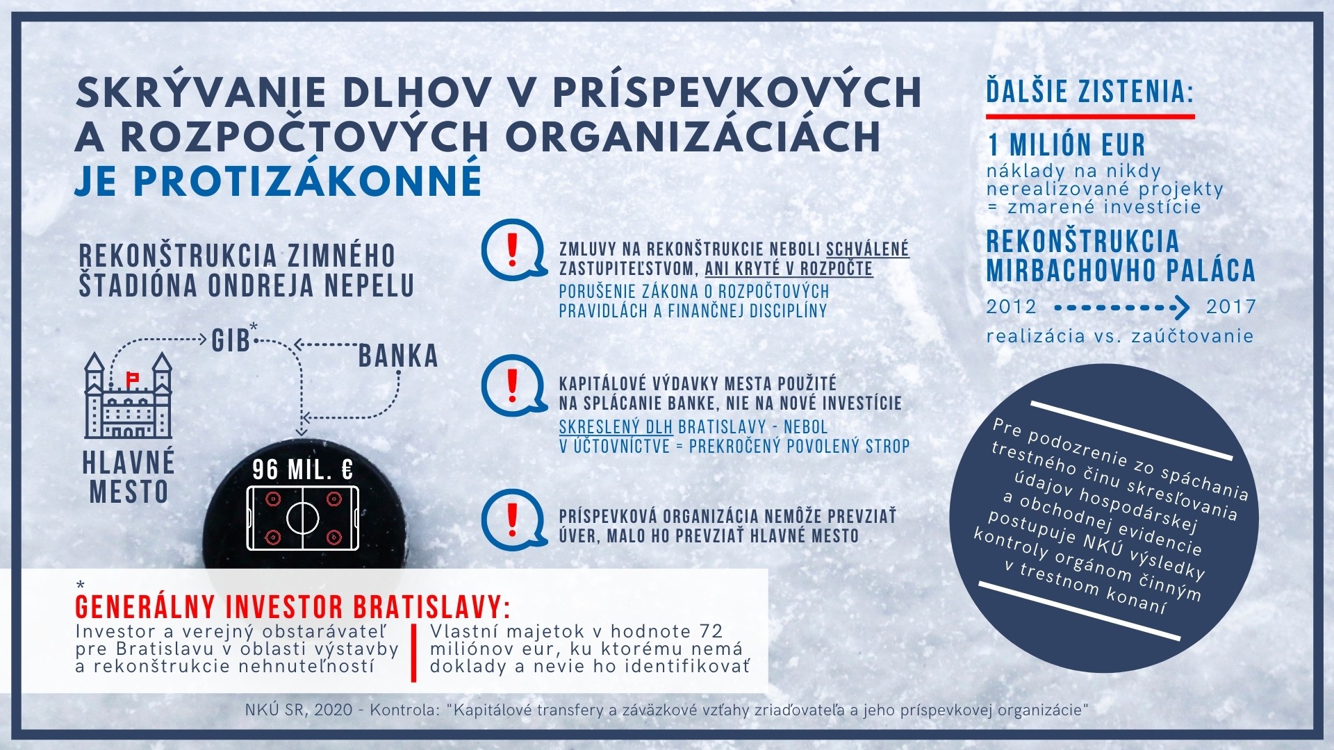 Najvyšší kontrolný úrad SR sa v kontrolnej akcii zameral na bratislavskú samosprávu, konkrétne na majetkové vzťahy medzi mestskými organizáciami a samotným hlavným mestom, ako ich zriaďovateľom. Predmetom kontroly za obdobie rokov 2011 až 2018 bola spoločnosť Generálny investor Bratislavy, ktorá je príspevkovou organizáciou mesta. Pre slovenskú metropolu plní funkciu investora a verejného obstarávateľa pri nových stavbách či rekonštrukciách nehnuteľností vo vlastníctve samosprávy. Jednou z takýchto investičných akcií bola aj rekonštrukcia zimného štadióna za takmer 100 miliónov eur počas obdobia rokov 2009 až 2011.