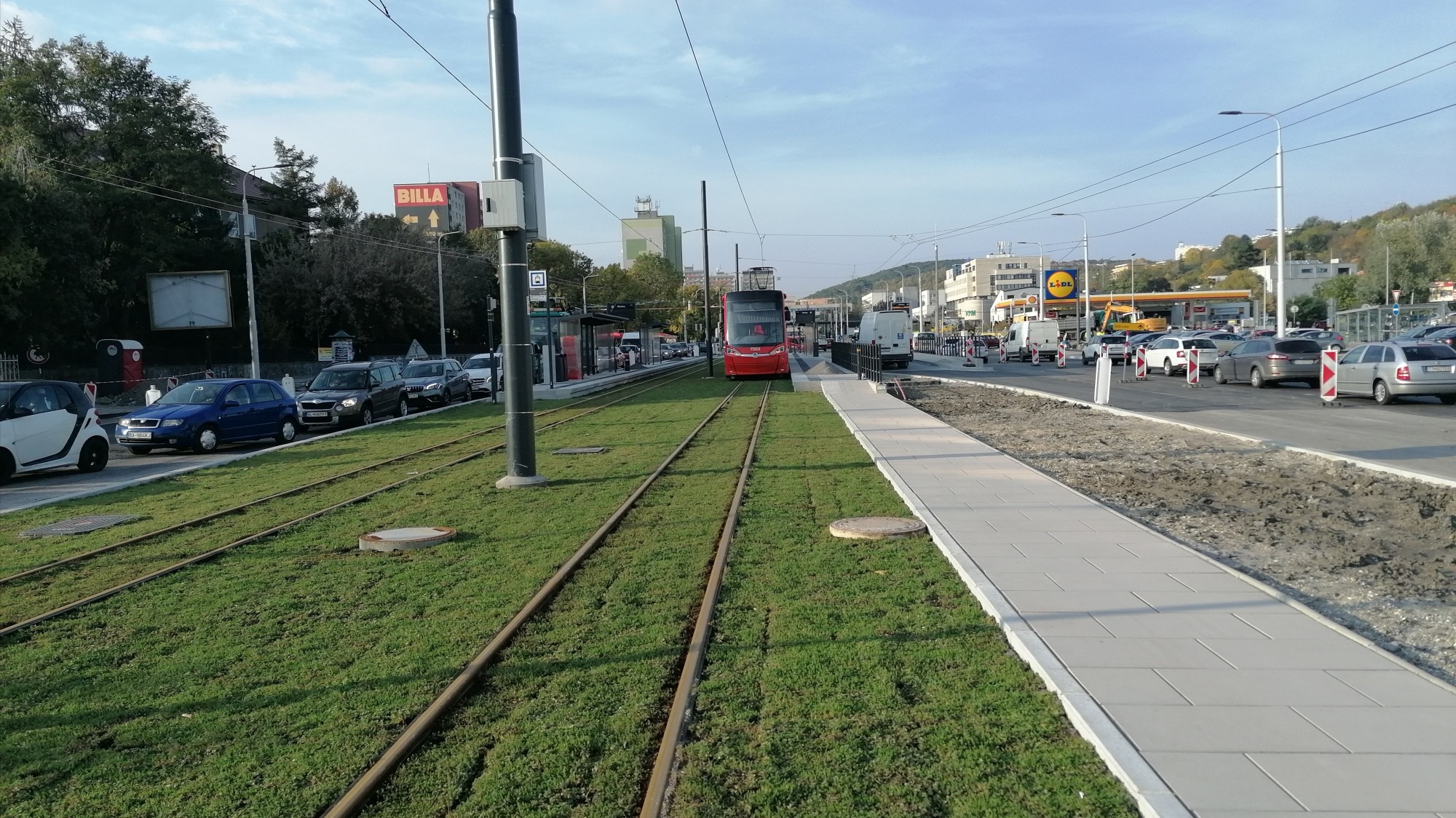 Modernizovanú električkovú trať na radiále už včera testovali technicko-bezpečnostnou jazdou. Minimálne dve veľkokapacitné električky môžete v okolí zastávky Molecova vidieť i v tejto chvíli. Práce na samotnej trati už finišujú, ale v jej okolí zostáva stále dosť rozkopávok.
